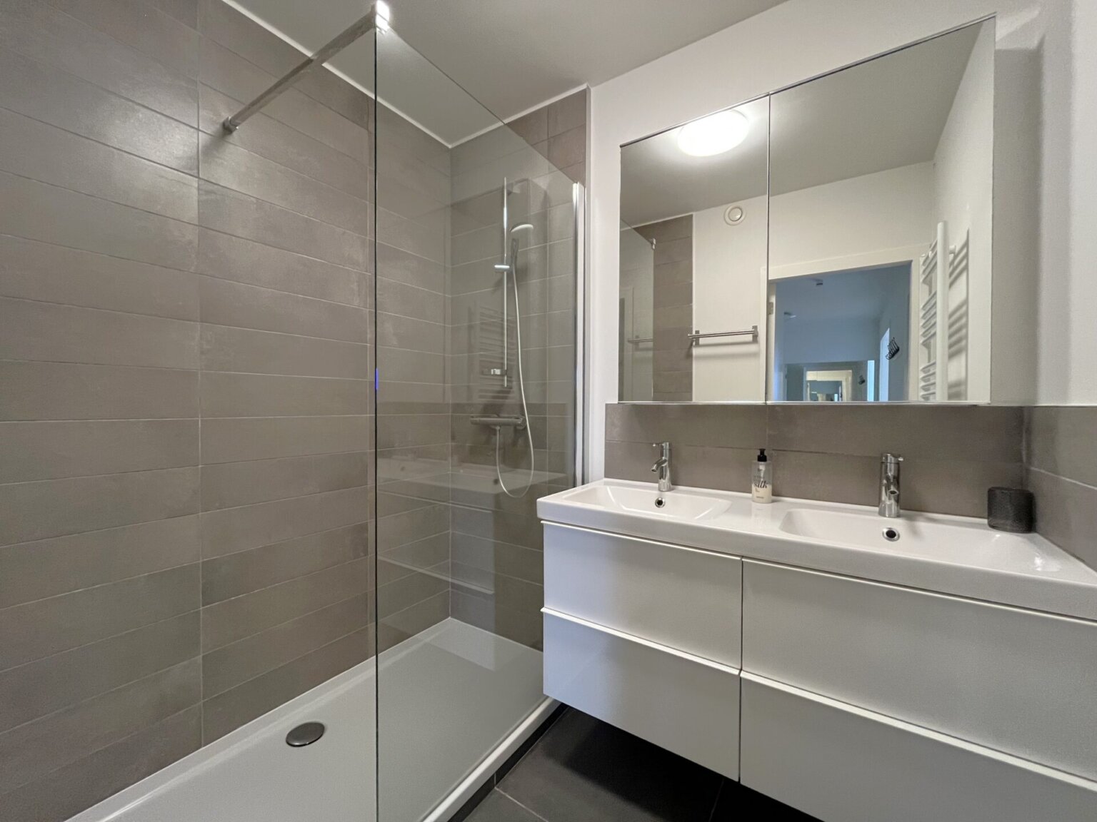 Appartement op de eerste verdieping: inkomhal met centrale gang – apart toilet – living – keuken – berging / wasplaats – slaapkamer 1 – terras vooraan – badkamer (douche, dubbele lavabo in meubel) – slaapkamer 2 – terras achteraan.